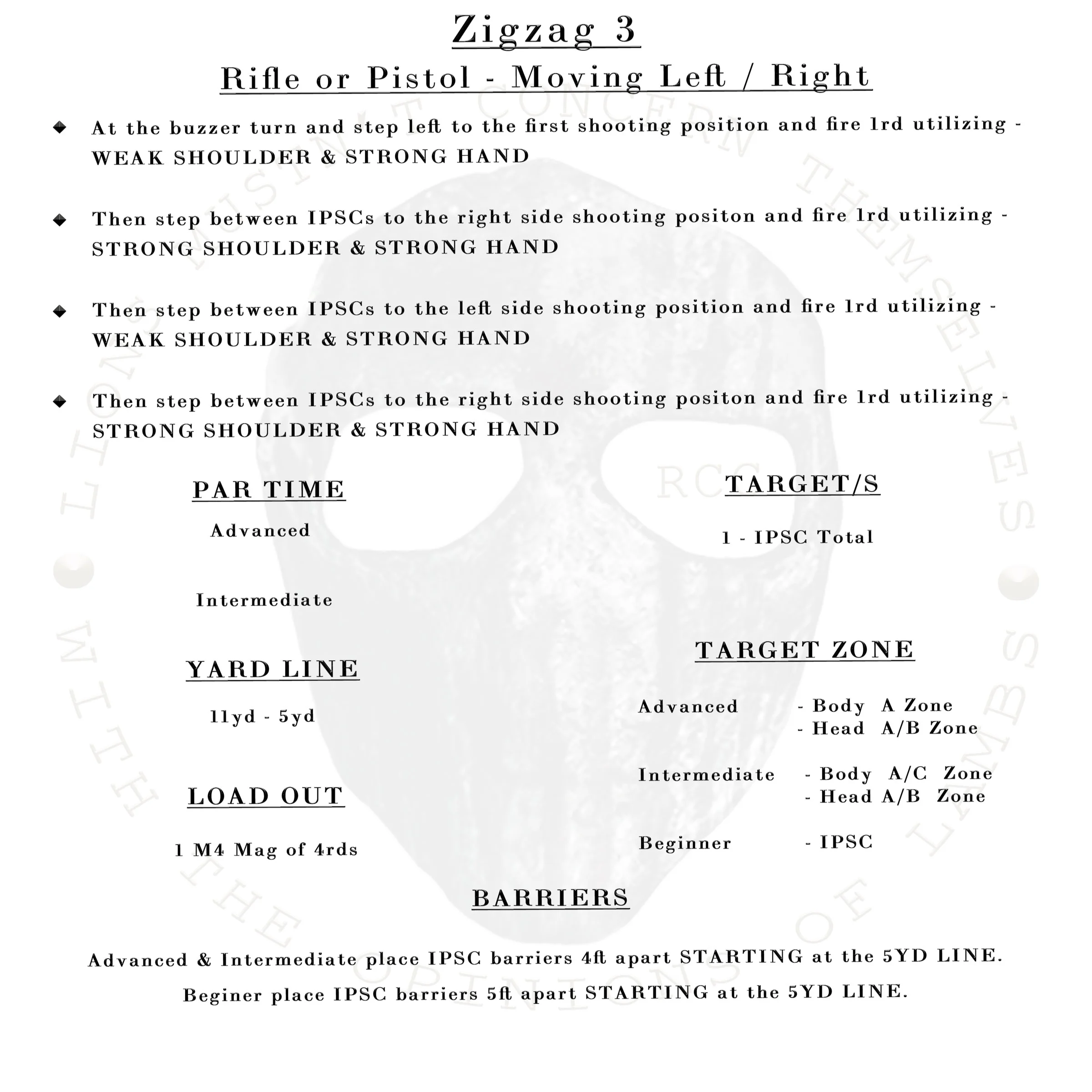 ZIGZAG DRILLS: These drills are designed to answer the questions: Which shoulder/hand placement is faster, which is more accurate and which is more sound? During these drills the shooter is measured on speed and accuracy within each variation. In doing so, the question of “which is best” is easily identified allowing the shooter to recognize & improve upon their weaknesses.